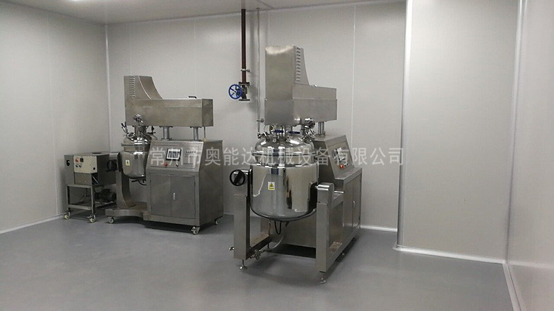 物料在水鍋、油鍋內(nèi)通過(guò)加熱、攪拌進(jìn)行混合反應(yīng)后,由真空泵吸入乳化鍋,通過(guò)乳化鍋內(nèi)上部的中心攪拌、聚四氟乙烯刮板始終迎合攪拌鍋形體,掃凈掛壁粘料,使被刮取的物料不斷產(chǎn)生新界面,再經(jīng)過(guò)葉片的剪斷、壓縮、折疊,使其攪拌、混合而向下流往鍋體下方的均質(zhì)器處,物料再通過(guò)高速旋轉(zhuǎn)的切割輪與固定的切割套之間所產(chǎn)生的強(qiáng)力的剪斷、沖擊、亂流等過(guò)程,物料在剪切縫中被切割,迅速破碎成200um-0.2um的微粒,由于乳化鍋內(nèi)處于真空狀態(tài),物料在攪拌過(guò)程中產(chǎn)生的氣泡被及時(shí)抽走。采用抽真空的方式,使所生產(chǎn)的制品在攪拌過(guò)程中不再混入氣泡,從而保證可制造出富有光澤、細(xì)膩及延展性良好的產(chǎn)品。
